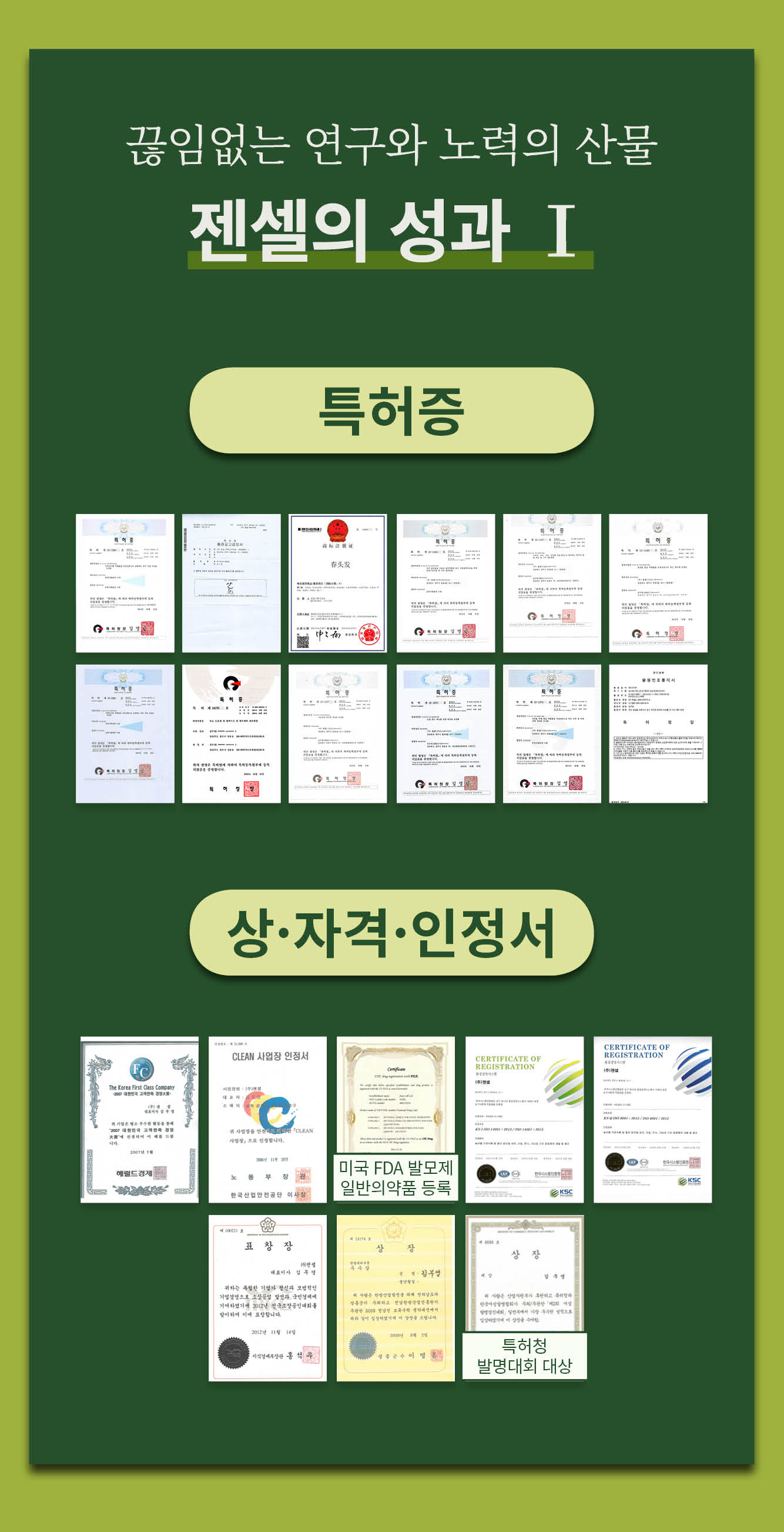 바이오셀은 2004년에 특허청 발명대상을 받고, 2005년도에 특허(국소도포제 및 환약으로 된 발모제의 제조방법)를 받은 제조법으로 만들어진 제품입니다. 발모관련 특허는 젠셀이 세계최초이자 아직까지 유일합니다. 젠셀 발모제품중에 가장 오래된 제품이며 2005년 이후로 수 많은 탈모인들을 해방시켜준 제품이기도 합니다. 호르몬제나 화학성분은 전혀 들어가 있지 않으며 100% 천연 약용식물로만 만들어 졌습니다. 그렇기 때문에 2005년 이후 지금까지 단 한명도 부작용이 발생된 사례가 없습니다. 미녹시딜이나 프로페시아 같은 화학성분의 약들로 인해 걱정하셨다면, 바이오셀은 안심하고 드셔도 됩니다. 제가 100% 보장합니다.